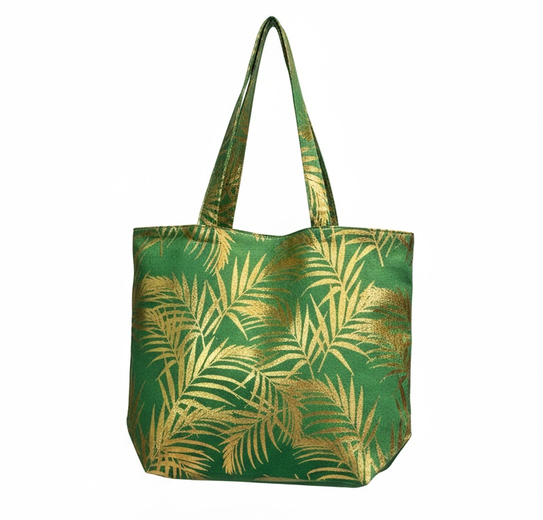 Le sac cabas est de couleur vert, avec une impression artistique de feuilles dorées sur le devant.