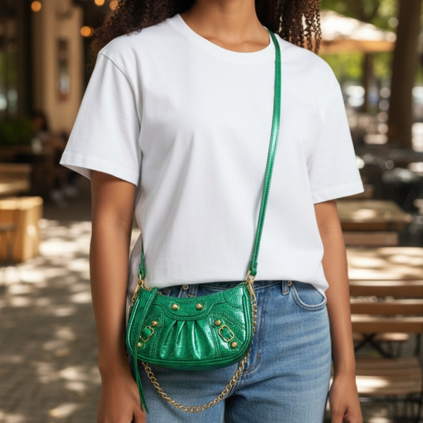 Découvrez l’élégance incarnée dans ce petit sac exquis, un mélange parfait de style et de fonctionnalité. Sa teinte verte, enrichie par un éclat métallique subtil, capte instantanément le regard.