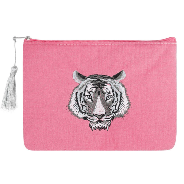 Cette pochette beige est ornée d’un design brodé représentant le visage d’un tigre en fil noir et blanc. Le tigre a une expression neutre et regarde droit devant lui. La broderie est détaillée, montrant les rayures, les moustaches et la texture de la fourrure du tigre. La pochette est équipée d’une fermeture éclair sur le dessus avec un pompon attaché à la tirette.