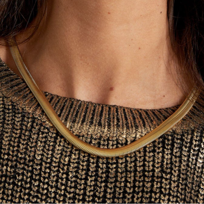 Ce magnifique collier doré arbore un design élégant et flexible, rappelant la fluidité d’un serpent. Composé de nombreux anneaux étroitement connectés, il offre une finition métallique lisse et brillante. Ce bijou polyvalent est parfait pour ajouter une touche sophistiquée à n’importe quelle tenue, que ce soit pour une occasion spéciale ou pour un usage quotidien.