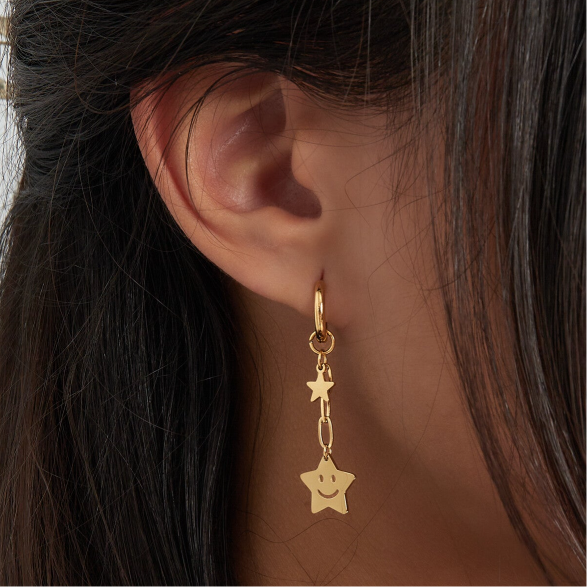 Cette paire de boucle d'oreille est vraiment charmante avec son pendentif étoile souriante ! Associez le avec le collier.