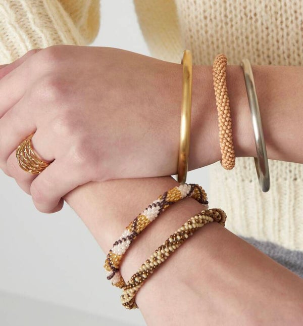 Ce bracelet est un mélange élégant de perles en bois naturel, de pierres précieuses et de perles métalliques, créant une harmonie parfaite entre la nature et le luxe.